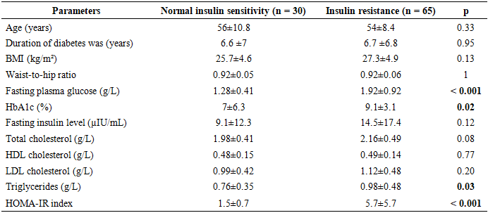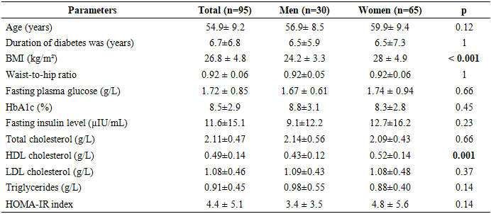 A total of 95 patients with type 2 diabetes were included in the study. The mean age was 54.9 ± 9.2 years, with a predominance of women (65 women, representing 68.4%). The mean duration of diabetes was 6.7 ± 6.8 years. The mean body mass index (BMI) was 26.8 ± 4.8 kg/m² and was significantly higher in women than in men (28.0 ± 4.9 vs 24.2 ± 3.3 kg/m²; p < 0.001).Regarding the metabolic profile, the mean fasting plasma glucose was 1.72 ± 0.85 g/L and the mean HbA1c was 8.5 ± 2.9%. Women had significantly higher HDL cholesterol levels than men (0.52 ± 0.14 vs 0.43 ± 0.12 g/L; p = 0.001). No significant sex-related differences were observed for the other biological parameters or for the HOMA-IR index (Table 1).Table 1. Demographic, anthropometric, and metabolic characteristics of patients with type 2 diabetes  |