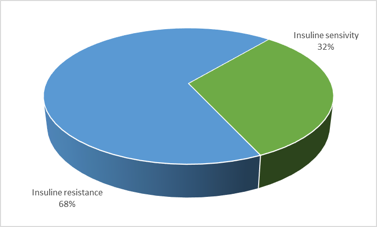 The mean HOMA-IR value in the overall study population was 4.4 ± 5.1.According to the HOMA-IR cutoff values, 65 patients (68%) exhibited insulin resistance, whereas 30 patients (32%) had normal insulin sensitivity (Figure 1). | Figure 1. Distribution of patients according to insulin sensitivity |