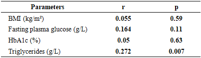 Patients with insulin resistance had significantly higher fasting plasma glucose (1.92 ± 0.92 vs 1.28 ± 0.41 g/L; p < 0.001), HbA1c (9.1 ± 3.1 vs 7.0 ± 6.3%; p = 0.02), and triglyceride levels (0.98 ± 0.48 vs 0.76 ± 0.35 g/L; p = 0.03) compared to patients with normal insulin sensitivity (Table 2).Correlation analysis showed a positive and significant association between HOMA-IR and triglycerides (r = 0.27; p = 0.007). In contrast, no significant correlation was observed between HOMA-IR and fasting plasma glucose or HbA1c (Table 4).Table 4. Correlations between the HOMA-IR index and anthropometric and biological parameters  |