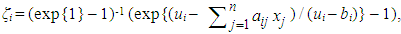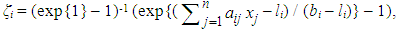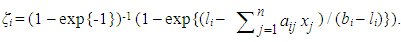 On the other hand, for the set of fuzzy goal constraints (2), the ith exponential membership function with increasing rate of change is presented as | (5) |