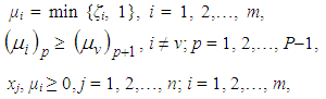 is the exponential achievement degree of the ith fuzzy goal constraint having priority level p, p = 1, 2,…, P, while kp is the number of fuzzy goal constraints having priority level p, i.e., the number of elements in set Ip. It is obvious that the objective function has been modified. Instead of maximizing the sum of all membership functions, the average of the membership functions for each priority level is evaluated while the sum of these averages is maximized. The main purpose of this modification is to remove the effect of the number of the membership functions in each priority level. In the two models (7) and (8), a set of system constraints