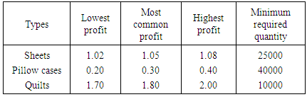 In this section, the textile production planning problem of Elamvazuthi et al. [17] is going to be utilized for a computational comparison between the two models. The structure of the problem takes the form of fuzzy linear programming. Therefore, this problem has been amended to be in the form of fuzzy goal programming. The problem assumes that there are three types of textile products (sheets, pillow cases, and quilts) where the decision variables x1, x2, and x3 denote the quantity produced from sheets, pillow cases, and quilts, respectively. The data of the problem are given in Tables 1 and 2.Table 1. The lowest, most common, and highest profit per unit, as well as the minimum required quantity for each type  |