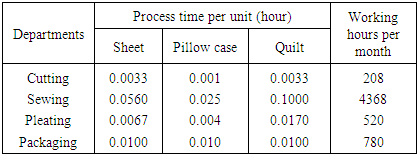 Table 2. The process time per unit, for each type, and the monthly working hours in each department |