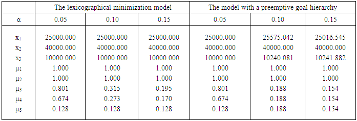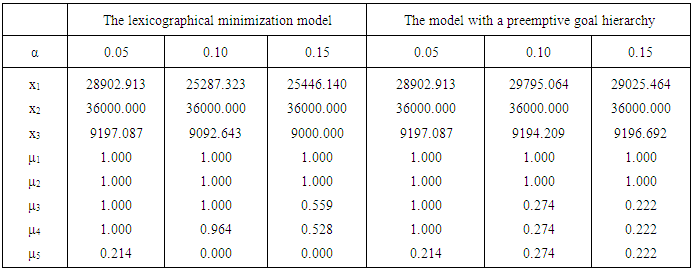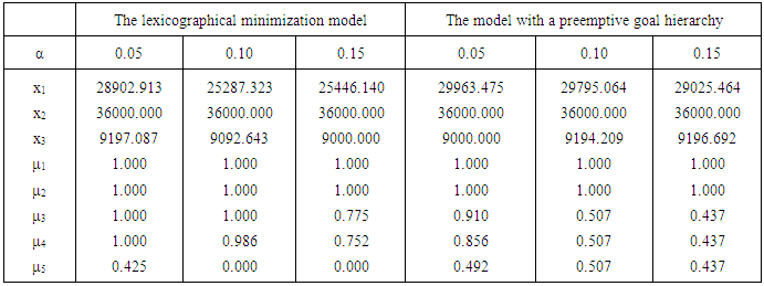 It is obvious that the values of the decision variables of the lexicographical minimization model have not been changed whether in the case of increasing or the case of decreasing rate of change, and for different values of α. This is mainly due to the system constraints which also prevent some of the goals having the first priority level to be achieved, since μ3 and μ4 are less than one, i.e., the third and the fourth goals are not fully achieved. This indicates that this model is less sensitive to the change in the results than the model with a preemptive goal hierarchy. On the other hand, it can be realized that whether in the case of increasing or the case of decreasing rate of change the total value of the membership functions of the five goals (the sum of the achievement degrees of all the goals) is higher in the case of the lexicographical minimization model than that in the case of the model with a preemptive goal hierarchy. This is for each value of α, except when α = 0.05 in the case of increasing rate of change, since the results of the two models are exactly the same. Moreover, the situation when α = 0.2 was investigated. It has been found that, whether in the case of increasing rate of change or the case of decreasing rate of change, there is no feasible solution for the model with a preemptive goal hierarchy, while there is a solution for the lexicographical minimization model. Afterward, the model with a preemptive goal hierarchy has been solved using the unmodified objective function, i.e., when the sum of all membership functions is required to be maximized. The results were similar to the results of the lexicographical minimization model that are given in Tables 3 and 4. Hence, the achievement value of the fifth fuzzy goal (which has the second priority level) is less than or equal to its corresponding value when the amended objective function is used, since the amended form removes the effect of the number of fuzzy goals having the first priority level. Moreover, the two models have been solved with an opposite priority structure, i.e., the fifth fuzzy goal has the first priority while the others have the second priority. The results of the lexicographical minimization model are x1 = 27766.990, x2 = 40000, x3 = 10233.010, μ1 = 1, μ2 = 1, μ3 = 0, and μ4 = 0 for the three values of α, and whether in the case of increasing or the case of decreasing rate of change. Only, μ5 = 0.340 in the case of increasing rate of change, while μ5 = 0.583 in the case of decreasing rate of change. Conversely, there is no solution for the model with a preemptive goal hierarchy in all the cases.Since the unchanged values of the decision variables for the lexicographical minimization model are mainly due to the system constraints, another computational investigation has been conducted by relaxing the system constraints. Accordingly, it is assumed that the minimum required quantity from each type is reduced by 10%. Thus, the three system constraints become x1 ≥ 22500, x2 ≥ 36000, x3 ≥ 9000.The two original models were solved according to the amended system constraints. The results are presented in Tables 5 and 6.Table 5. The case of increasing rate of change, according to the amended system constraints  |