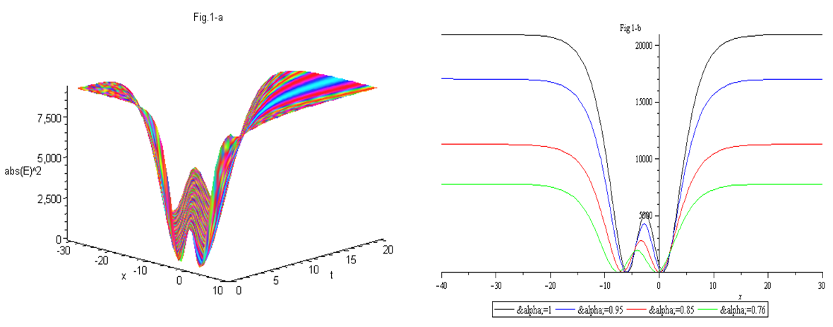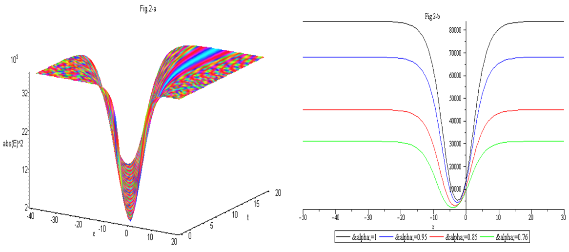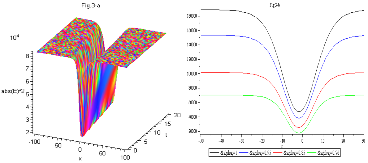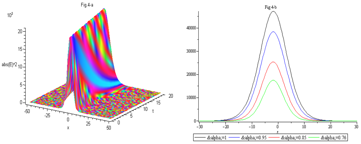 ![]() | Figure (4). Evolutional behavior of given by Eq. (43) of the bright soliton with (a) Intensity versus x and t at (b) Intensity versus x at and ![]() |