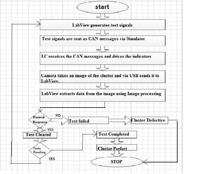 A closed loop system to automate the testing of instrument clusters in the automotive industry was developed in LabVIEW using Image Processing and CAN. The system is capable of generating test signals and driving the instrument cluster. The corresponding response of the cluster is then captured by the camera and sent via USB to LabVIEW. The image is processed using LabVIEW and data is extracted from it. The cluster output is read and LabVIEW checks if the cluster response was appropriate[8,9]. This automation of the testing is carried out in the prototype phase of cluster development. The tedious, labor intensive and time consuming task of manual testing can be made easier using this system.The system is flexible and can be used on a wide range of clusters just by tweaking system parameters, while reference images of telltale indicators allow the system to adapt to new additions of such indicators in instrument clusters. The real time ROI selection tool also makes it independent of the positioning of various indicators and blurring caused by movement of the camera or the cluster. Instrument clusters contribute significantly into ensuring safe and informed driving. Thus, the thorough testing of instrument clusters is vital before deployment onto the vehicle. There are hundreds of test signals which need to be run on instrument clusters and suppliers intend to slowly automate the entire testing process by incorporating more test signals and test sequences into the current program. Various combinations of signals that drive indicators and gauges are to be sent together to ensure accurate response under all conditions.