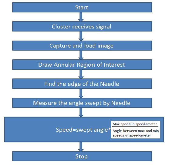 Identification process for the speed as indicated by the needle of the speedometer is dealt here. When the message for the test is received by the cluster, a real time input is taken by the USB Camera[6]. This image is captured and loaded on to the VI. An annular search region is drawn on the image with the ends of the region coinciding with the extremes of the speedometer and then the edge of the needle is detected using edge detection. Measure the angle swept by the straight line from starting of the annular ROI. This angle helps to determine the original speed indicating in the meter as shown in Fig. 5. | Figure 5. Flow Chart for speed Test |