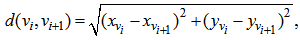 where d(vi,vi+1) is the cost of the edge e(vi,vi+1) between the vi and the vi+1 (i=1,…,N, vN+1=v1). The optimal tour X* is shown as follow, | (3) |