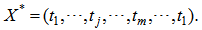 Because the second necessary condition leads the optimal visiting order of the cities on convex hull, the optimal tour can be divided into some paths at the cities on convex hull with optimality. Such a city on convex hull C is called a terminal t. When the number of terminals is m, the number of paths is also m. The optimal tour X* can be replaced with the ordered terminals tj in C (j=1,…,m) as follow, | (6) |