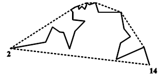 The SHPPs which are converted from the TSPs have the two special conditions; (1) the starting city vs and the terminating city vt are neighbouring on convex hull C, and (2) the cities are distributed only in one side of the straight line connecting the vs and the vt. And it is clear that the terminals tj in the optimal path are also visited with the appearing order on the convex hull C. That is, the necessary conditions for optimality can be applied to the SHPPs in the same way for the TSPs. Furthermore, a SHPP also can be replaced with a classification problem and m SHPPs. Figure 2 shows the optimal path and the convex hull of a SHPP as a sub problem of the instance berlin52 in TSPLIB. This figure indicates that the second necessary condition is also kept in the SHPPs. | Figure 2. A SHPP as a sub problem of berlin52 in TSPLIB. Solid lines are the optimal path from the starting city 2 to the terminating city 14 in this sub problem, and broken lines are the convex hull of this city set |