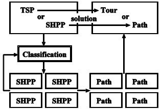 As shown in Figure 3, while repeating the replacements for each SHPP until the sub problems include only two cities, after all, the TSPs in Euclidean plane can be replaced only with the classification problems.  | Figure 3. The proposed framework for the TSPs in Euclidean plane |