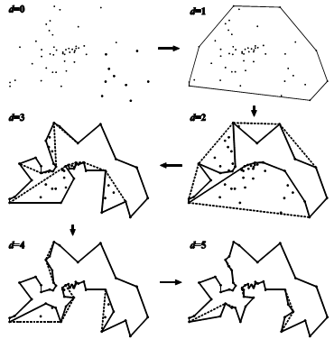 Thus, the substance in our framework is the classifier for the cities vi not in C, and the quality of solutions depends on the error in the classifications. Alternatively, depending on the number or the distribution of the cities in the SHPPs, we should directly solve the SHPPs without the replacement.For example, Figure 4 shows the optimal classifications of the TSPLIB instance berlin52 when the instance is replaced only with the classification problems. The variable d is the depth in tree structure described in the next section. After the calculation of convex hull, the cities not on convex hull are classified into some subsets as SHPPs. And the convex hulls for each subset are also calculated. Finally, a solution tour is constructed through the process. | Figure 4. The optimal classifications as the convex hulls of berlin52 in TSPLIB. The solid lines are the edges of convex hulls, and the broken lines are the edges replaced with some paths as solutions of SHPPs |