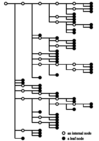 If the internal node at the v’ has over three children, the movement of a leaf node take only an increase of internal node without a decrease. From the state (a) to the state (a)’’, the movement of the internal node u take only a decrease of internal node.Consequently, When the root node has all of the leaf nodes, the number of internal nodes is minimum as H=1, and when the root node has three child nodes and all of the internal nodes has two child nodes, which a child node is an internal node and the other is a leaf node, the number of internal nodes is maximum as H=N-2. Therefore, the range of H is shown as follow, | (16) |