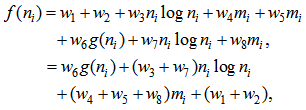 where wi is the suitable coefficients in computation for each procedure. If the cost g(ni) is equal to or less than nilog ni, the f(ni) is expressed with a coefficient w as follow, | (12) |
