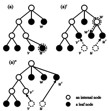 To estimate the range of H, with the tree structure for TSP tours in our framework, we consider the influence when the sub sets, which the cities not on convex hull are classified into, are changed. These changes could be substituted for the moving of leaf nodes in the tree structure.At first, it is clear that each internal node inevitably has two or more child nodes except the root node which inevitably has three or more child nodes, because a TSP must have at least three cities for constructing a tour and also a SHPP must have at least two cities for constructing a path.In Figure 7, the movement of a leaf node u from the state (a) to the state (a)’ leads taking an increase of internal node at w with the shift of a leaf node from the place w to the place w’, while the movement of a leaf node v leads taking an decrease of internal node with the shift of the leaf node from the place v to the place v’.  | Figure 7. The numerical changes of internal nodes |