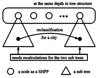If a city or some cities are reclassified from a subset to another subset, the recalculations are needed for the two sub trees which are associated with this movement. The root nodes of these sub trees having the same parent at the same depth in tree structure. The tour improvement should be performed in such way while comparing the tour costs.Since the improving process is the recalculations for some sub trees, our framework could be applied to the methods which have the procedure depends on tree structure such as Genetic Programming (GP)[17],[18]. Insofar as we know, however, there is any method with GP for the TSPs though the many constraints will be required. If we achieve the construction of an effective method with GP, new intelligence may be given for the TSP.
