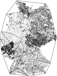 Although we can construct a classifier in machine learning systems only with the geometric information such as the coordinates of cities, however, through generating the learning data for the TSPLIB instances with the optimal tours, the optimal classifications provide us the knowledge that the convex hulls generated as the optimal classifications are frequently overlapping each other in geometry. These overlaps appear in the instances which have over 100 cities. Figure 10 shows an example of the overlapping in optimal classification for the instance d15112 of TSPLIB. These convex hulls are at the depth d=1 in tree structure. There are 21 internal nodes as convex hulls and 2 leaf nodes as edges. This matter exhibits that only the simple geometric information such as the equation (18) cannot generate the optimal classifications, and that the topological information such as a minimum spanning tree will be essential to realize the optimal classifications. Consequently, for the classifiers in machine learning, we must use quantity of many various features not only the geometric information but also the topological information through trial and error. | Figure 10. The overlapping of the convex hulls at the depth d=1 in the optimal classifications for the TSPLIB instance d15112 |