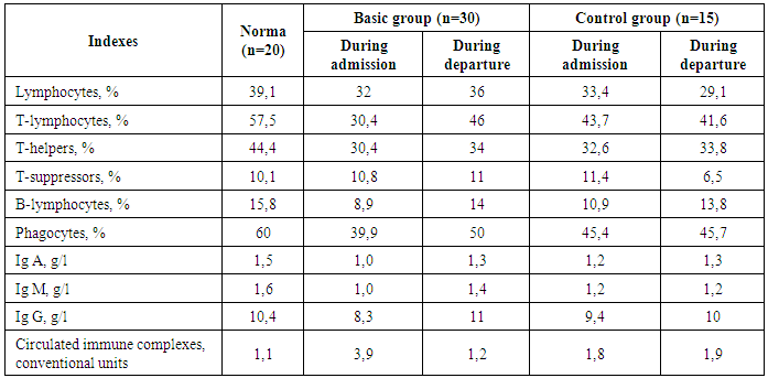 The present work presents the results of surgical treatment of 178 patients with chronic recurrent hematogenous osteomyelitis (CRHO) of the long tube bones. 50% were patients with the age from 12 to 16 years old, 30% - ones with the age from 16 to 22 years old. Boys made the most off the total - 112 (62.9%) patients.Depending on the methods of surgical treatment all patients were divided into two clinical groups. Control group included 100 children with CHO of long tube bones receiving traditional surgical treatment. Study group comprised 78 patients who had surgical treatment by the elaborated method; earlier all patients of this group were repeatedly operated due to CHO and its recurrences.During the analyses of the disease duration it was determined that the chronic hematogenous osteomyelitis more often lasted 4-7 years (50%) in basic group of patients, and 1-3 years (86%) - in the control group of patients. Predominance of the long period of disease in the basic group was associated with the chronic recurrent hematogenous osteomyelitis; in this occasion it had been carried out sequestrectomy of the injured bone. Examination determined that sequestrectomy was carried once in 144 (80.7%) patients with the chronic osteomyelitis, 34 (19.3%) patients were surgically operated twice. In the both groups osteomyelitic process most often took place in shin bone in 73 (43.7%) patients and in femoral bone in 66 (39.5%) patients.Before the complex of investigation and surgical treatment we agreed on the consent with the parents of all children for the planning diagnostic and treating manipulations. The study of some indexes of the immune system in 45 patients of the investigated groups has been carried out in order to determine immune status of the patients with CRHO in the treatment process. 20 practically healthy investigated persons consisted in the comparison group. The abrupt reduction of the amount of T-lymphosytes (30,4%), T-helpers (30,4%), B-lymphosytes (8,9%) and fagosytes (39,9%) in the comparison with the normal indexes and control group have been noted in the patients of the basic group before surgical operation which testify about chronic reduction of the immune resistance of the organism in CRHO. During the repeated control of the indexes before departure from hospital reliable increasing of all investigated immunologic indexes in the basic group of patients have been noted in the basic group of patients whereas in the control group they were lower than normal indexes (table 1). It is needed to note that in patients it has been determined significant reduction of the immune resistance of the organism, reduction of T-system of immunity and neutrophyl phagositosis. During the investigation of index of blood toxisity (IBT) bebore surgical operation the increase of indexes have been determined not only in the basic group (41,9 units), but also in the control group (43,7 units) in the comparison with normal indexes (28,4 units). Before departure from hospital IBT in the basic group was 29,7 units whereas in the control group it was 33,4 units.Table 1. The indexes of the immune status in patients  |