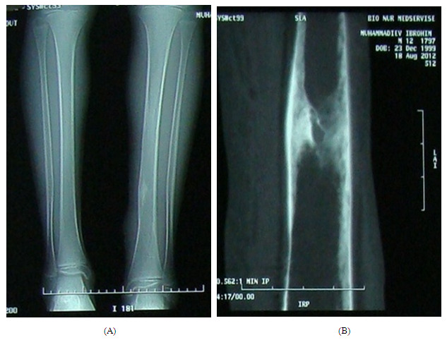 Statistic processing of the received results has been carried out with the use of the package of applied programs for biomedical investigations with calculation of the mean arithmetic (M), its errors (m) and standard deviation (σ). The reliability of the differences between two means (t) has been determined by Student-Fisher criterion with computer processing by Excel program.Computer tomography (CT) was included in the complex of preoperative diagnostics alongside with general clinic, laboratory and plan radiography in all patients. CT, in contrast of plan radiography, allowed determining more exactly the real sizes of destructive process in the injured bone (Figures 1 а, b). | Figure 1. General X-ray examination (А) And computer tomography (B) Of the right shin bone. It has been determined the presence of intraosseous abscess which clearly visualized on CT |