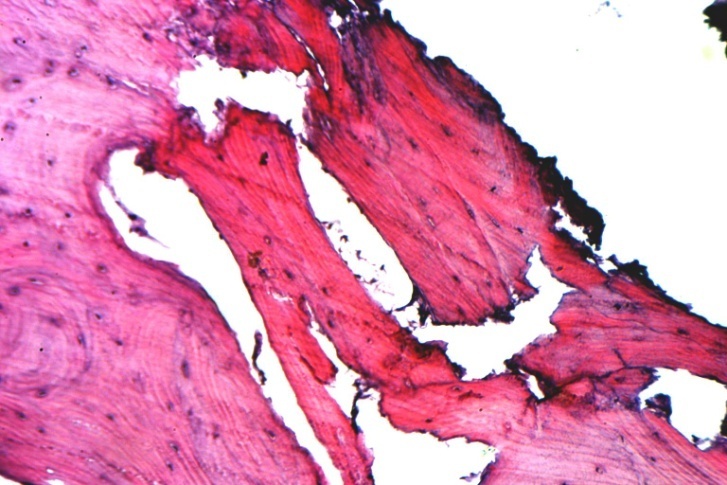 With the purpose of the study structural features of the bone tissue in patients with CRHO it has been carried out morphological investigation of the osteomyelitic foci received during surgical operation. Morphological investigations showed that in CRHO it has been significantly changed the structure of bone narrow (pyknosis of bone narrow cells and perinuclear edema with enlargement of fibers of connected tissues). Necrosis of osteocytes, destruction of the bone plates up to disintegration of fiber components of bone tissue were noted in bone tissue. Necrotic fragments of the bone tissue were undergone sequestration (Figures 2, 3). Micro-abscesses were found between the fibers of the connected tissue. | Figure 2. Formation of sequesters in the necrotic bone |
