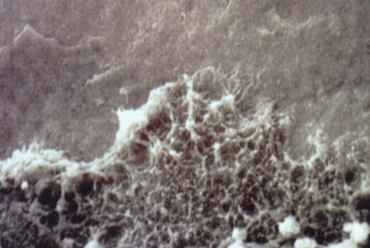 | Figure 3. Necrotic bone tissue of sequesters with the saved viability part of bone. sem Х 4000 |