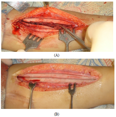 All patients of the basic group have been performed surgical treatment by the proposed method (patent “Method of surgical treatment of chronic recurrent hematogenous osteomyelitis” IAP 03377, Uzbekistan). Operative treatment was undertaken after reduction of acute inflammatory process. Operative intervention was carried out under general anesthesia.The choice of access to the pathological focus is the important moment of any operation. In the case of injures of shin bone the most optimal is anterior-lateral access, while the lateral access is preferred in the injures of the femoral bone. The skin incision with syringectomy or without it could be some longer than the assumed destructive focus in the bone. Thickened periosteum was longitudially dissected through dissection of layers of subcutaneous tissue, fascia and by moving muscles to both sides. Periosteum was carefully separated from the bone in both sides along the whole length of the injured part of the bone. Delicate caring to periosteum was the factor for good reparative bone regeneration in the postoperative period. Visually cortical layer of the bone had uzuration, and often there was bone thickening in this area. Longitudial osteotomy of the bone was carried out in 6-10 mm wide and in length of the appropriate extend of pathological changes of the bone tissue. Depending on the revision results and condition of the pathological process the defect could be longitudinally enlarged to the optimal length. Opening of intramedullary canal was being followed by sanation stage of the pathological focus. Sanation began with lancing of intraosteal abscesses with mechanical cleansing of the internal walls of the bone cavities from the areas of osteonecrosis and purulent detritus (Figure 4). The same manipulation was performed with the bone areas lacking viability. Sequestrectomy was carried out on the whole sphere of the bone cavity until visually viable bone. Few cavities, scattered on the whole bone diaphysis with osteosclerotic septum, were excised by forming the single cavity; it resulted with restoration of the anatomic structure of intramedullary canal on the whole length. The formed cavity was being modeled by compacting and rounding edges in order to form wash-tub. | Figure 4. Longitudinal Osteotomy, Sequestrectomy of the Right Shin Bone (A) - It has been Determined Destructive Injury of the Shin Bone with Central Sequestrums; (B) - Visualization of Medullary Canal Aftermechanical Sanation with the Use of Usc) |