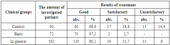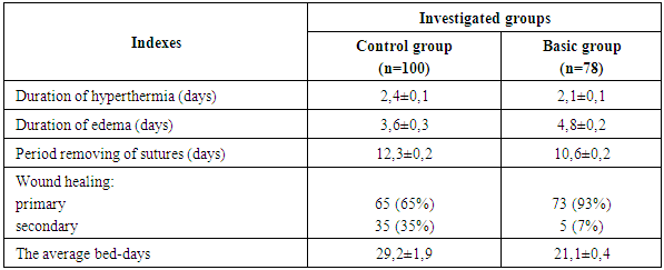 During the analyses of the direct results of the treatment it was determined that normalization of the body temperature in patients of the control group was occurring on average in 2.4 ± 0.1 days, in the basic group this index was taking place during 2.1 ± 0.1 days. Healing of the wound by primary adhesion during traditional treatment has been obtained in 65 (65%) patients, whereas in the basic group it has been obtained in 73 (93%) patients. Sutures from the wounds in the control group were taken off on average in 12.3 ± 0.2 days, while in the basic group this index made 10.6 ± 0.2 days. Duration of the patient’s hospitalization were linked to the effectiveness of disease treatment in the clinical groups and significantly decreased in the basic group in 21.1 ± 0.4 days against 29.2 ± 1.9 (р < 0.001) days in the control group (table 2). Table 2. Clinical effectiveness of the methods of surgical treatment in the investigated groups  |