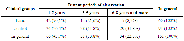 One of the main manifestations of recurrences of CRHO was the case of the opening of the sinus tract which had been developed only in 3 (3.3%) patients of the control group. During the investigation in the period of 1-2 years after operation, the recurrence of the purulent process with subsequent sequestrectomy was found in 4 (4.4%) patients of the control group, while the recurrence was not noted in the basic group during this period of examination. In the period of 3-5 years after operation, repeated sequestrectomy was carried out in 4 (4.4%) patients of the control group and in 1 (1.2%) patient of the basic group. During the study of the distant results in the period of 6-8 years after operation, the recurrence of the pathological process requiring repeated sequestrectomy was observed in 5 (6.6%) patients of the control group. Analysis of the distant examination periods found that the general amount of recurrences and repeated sequestrectomies took place in 13 (14.3%) patients of control group, whereas in the basic group we noticed the obvious tendency to decrease of the recurrences and repeated sequestrectomies until 1.2%. Good results were fixed in 88.3% of patients of the basic group and only in 75.9% of patients in the control group. Satisfactory results in the basic group were in 8.3% of cases, while in the control group they were noted in 8.8% of cases. The amount of unsatisfactory results in the basic group was significantly less (1.2%) than in the control (15.3%) group (table 4).Table 4. Distant observation periods of patients in the investigated groups  |