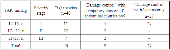 Surgical interventions in 40 patients were completed by suturing the anterior abdominal wall tightly, in 9 patients - “Damage control” with temporary closure, and in 27 patients - “Damage control” with laparostomy (table 2).Table 2. IAP in patients during the admission from the operating room  |