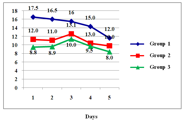 Intraabdominal pressure was not detected in the third group of patients (patients with laparostomy). In patients of the first and second groups upon admission to the ICU IAP> 12 mm Hg was 76.8% and 36.4%, respectively (p <0.05). Among the patients included in the first group, there was a significantly higher incidence of IAP from 16 to 20 mm Hg compared with the second group (p <0.05).During the IAP assessment, it was revealed in dynamics that in patients of the 2nd and 3rd groups this criterion was identical (without the presence of significant deviations) and after the entire observation period compared with the 1st group, in the presence of significant differences in the 1st , 2nd and 4th day of observation (p <0.05) (Fig.1). | Figure 1. Dynamics of intra-abdominal pressure over 5 days in patients with various options for closing the abdominal wound |