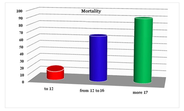 The high incidence of acute cerebral insufficiency in all groups is explained by the nature of the injury, that is, abdominal injuries were almost always combined with craniocerebral, which caused a neurological deficit by the Glasgow coma scale. Manifestations of hepatic impairment were not noted in any of the cases, and disturbances of the coagulating system were also rare and did not significantly differ between the groups. But, nevertheless there were significantly more patients with disorders in the cardiovascular, urinary and metabolic systems, in the first group. This group of patients actually needed much more inotropic therapy. The SOFA score gave a truly greater score in the severity of organ disorders in the first group. The overall mortality rate in patients (from 76) with abdominal injuries with severe polytrauma was 67.8%. 35 from 40 (87.5%) patients of the first group died, in the second - 4 from 9 (44.4%), and in the third - 13 from 27 (48.1%). Differences between the 2nd and 3rd groups are not significant (p <0.05). However, the differences in the indices of the 1st and 2nd , the 1st and 3rd groups are significant (p <0.05). The treatment results were studied in absolutely all patients with different IAP scores at the time of admission to the ICU. The average IAP in those patients who survived was 8.5 ± 3.2 mm Hg, and in deceased patients it made up 24.2 ± 1.8 mm Hg (p <0.05). But in this case, there was a natural dynamics of increasing mortality with increasing of IAP. Moreover, mortality in patients with ACS (n = 12) was 100%. Then, the mortality depending on the IAP upon their admission to the ICU was analyzed (Fig. 2). | Figure 2. Mortality (%) in groups depending on the IAP rate |