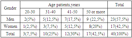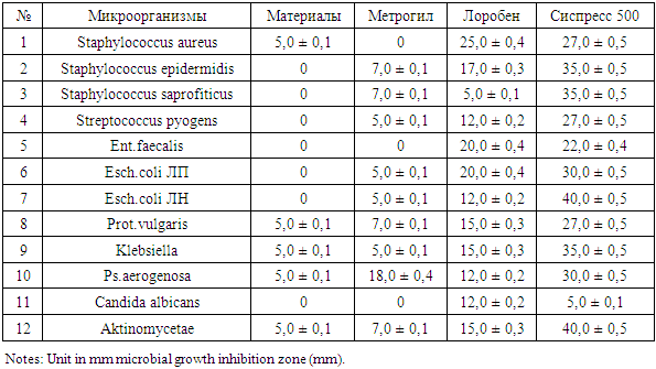 Microbiological examination included selection of microflora from saliva collected via oral rinses with sterile saline. Identification of isolated bacteria, using anaerobic culture techniques. Taking the material was performed eight times: before surgery before and after prescribing. The capture of the material after the operation was carried out in the early stages after 3, 7, 14, 30 days after the dental implantation.It is known, that an infectious-inflammatory processes significantly increases the probability of graft rejection. By this, it is urgent to develop activities aimed at the prevention of these complications arising during this kind of intervention. In recent years, in the global dental practice, when performing dental implant, actively implemented methods of the preoperative prevention based on the use of highly effective antiseptics and antibiotics (VN Tsarev, RV Ushakov VI Chuvilin, 2000).However, for prescribing effective drugs of directed action (antibiotics) it is necessary to have clear evidence of a potential-aggressive microbial flora of the patient and its sensitivity to various antibiotics. Taking into account the above aspects, prior to the microbiological and immunological studies of oral fluid in patients with diabetes to whom recommended dental implantation, we assessed the effectiveness of the use of several drugs, such as: metrolin, metrogil, loroben, sispress 500, in order to preoperative preparation of patients, in conditions in vitro!The data obtained in these studies are shown in Table 2.Table 2. Sensitivity Characteristics of microbes to some drugs in the conditions in vitro!  |