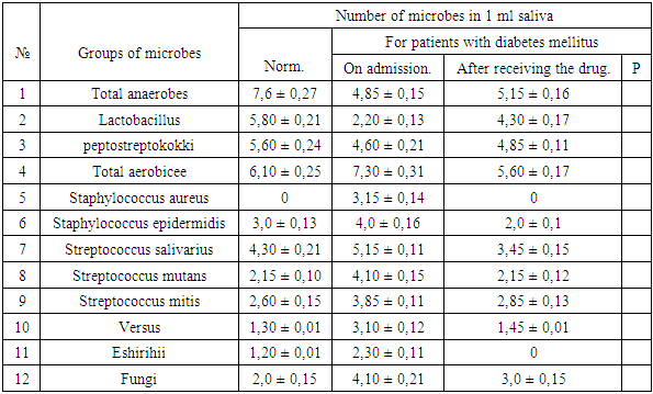 The table shows that the drug metrogil not has antibacterial properties, at the same time drug metrogil had a significant impact on the culture (Pseudomonas aerogenosa) which amounted to 18,0 ± 0,4 mm. Drug loroben has effects on almost all studied groups of microbes, except for culture Staphylococcus saprofiticus. Interestingly, this drug were moderately sensitive both gram-positive and gram-negative microbes including fungi. Among all tested drugs the strongest antibacterial effect had a sispress 500. As can be seen from the table, highly sensitive were eshirihii and actinomycetes, which equaled 40.0 ± 0.5 mm. and the remaining groups tested germs were also highly sensitive from 22,0 ± 0,4 to 35,0 ± 0.5 mm, and only fungi of the genus Candida seemed insensitive.Microbiological studies of quantitative parameters of microbes in the mouth of patients with diabetes mellitus after preparation pre operating using the above drugs are presented in Table 3.Table 3. Indicators of oral fluid flora in patients with diabetes mellitus lg (M ± m) cfu / ml  |