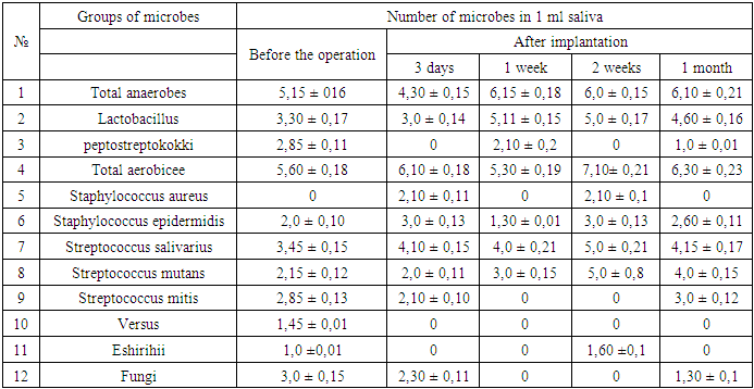 The table shows that all the studied groups of microbes have a positive quantitative shift is actually close to normal and only the number of Candida fungi several high data apparently used drugs do not have antifungal activity.The next group of our study consisted of patients with diabetes who underwent dental implantation. Microbiological examination of these patients after surgery performed in dynamics: 3-7-14-30 on days -that was the early period of observation, these same patients in the study continued and long-term periods of observation - is 3-6 months. Materials of microbiological studies carried out in the early stages of the observation are shown in Table 4.Table 4. Characteristics of oral flora in patients with diabetes, after dental implantation and bone grafting in the early stages. lg (M ± m) CFU / ml  |