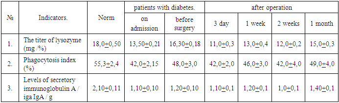 The table shows that on day 3 after surgery microbial picture is somewhat deteriorated in comparison with the picture pre operation. At the same time, these changes have a tendency anaerobic flora decreased slightly, but increased somewhat the facultative. It is particularly alarming, the emergence of oral strains of pathogenic staph (Staphylococcus aureus).Interestingly, in the observations on 7 the day microflora of the oral cavity differ mostly positive changes, so anaerobic flora even increased in comparison with the picture before the operation. Optional flora close to the norm, which is particularly pleasing, that one that some microbes such as pathogenic staphylococci, Streptococcus mitis, against Eshirihii and fungi in general i.e. eliminated the disappeared, and it is these microbes, mostly due to the large set of fragments pathogenicity, and are the cause of inflammation after surgery.On 14th day of the study can be noted that improvements available at 7 days, not only retained, but also further improved because anaerobic flora was slightly higher compared to pre operation. However, the alarming increase in the number of facultative flora, so the total number of the picture was lg 7,10 ± 0,21KOE / ml. Apparently the picture can be explained by the fact that on the 14th day ended compensatory adaptive processes in the oral cavity and the dose of drugs were found sufficient to suppress facultative flora.and observed the emergence of strains of pathogenic staphylococcus. However, the most interesting picture of the oral microflora we observed in the 30 day study, the actual quantitative parameters flora in anaerobic as well, and an optional very close to the normal range, and is particularly pleased with the elimination of such of microbes as pathogenic staphylococci, Proteus and eshirihii. We would like to emphasize that these positive developments occurring in the microflora of the oral cavity in patients with diabetes who underwent dental implants and bone grafting correlate with the picture of the clinical course of these patients. In table №2 figures, at patient’s admission, Staf Aureus in liquid oral flora is present in significant amounts. After receiving the drug prior to surgery, he is eliminated. Further Strep. Mutans fungi, at admission of patient, exceeds the norm by 2 times. Then, after taking the drug figures are normalized.In Table №3 on the 3rd day after the operation the number of Staf. aureus risen again. By the 1st week after surgery it normalizes. By the 2nd week indicator Staf. aureus grows.This is because the medication after the operation is completed at the expiration of 1 week after implantation. The same trend is observed in Strep. mutans. A figure Strep. Salivarius to 2nd week increased slightly, and the first month is normalized.In the table 5, at admission, indicator of the titer of lysozyme reduced.Table 5. Indicators of local oral defense factors in patients with diabetes, after dental implantation, in the early stages  |