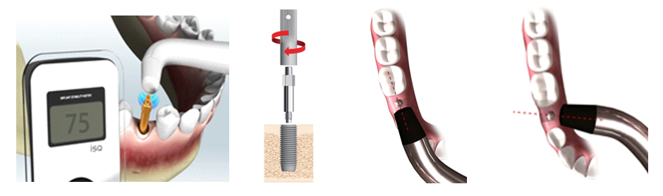 Before the operation, after taking the medicines it is close to normal. Further to third day after surgery, the level of its amount reduced due to traumatic shock. In subsequent periods, his figure is closer to the norm.The morphological and functional evaluation of bone tissue reconstruction after guided bone regeneration with the use of hyaluronic acid, we carried out a dynamic study of the structure of the bone tissue before and after dental implantation. Bone density was assessed by Haunsfield scale units - HU on the results of the 3D X-ray multispriral computed tomography «Sirona - Galileos» (Germany), «VOLUX- Triana» (South Korea), «MORITA» (Japan), Philips (Germany), radiovisiography (the unit "AnyRay-ANR2-0210", the sensor "EzSensor-CR1, 5D-09-0020", VatechE-WOOTehnology, South Korea).The program allows you to map gray values on the CT scan linearity of gray on the monitor, which objectively assesses the structure and bone density.We obtained data the average bone density units scale Haunsfield - HU comparatively evaluated the results obtained Misch classification of bone type.1) 1150 and more Haunsfield scale units - HU, consistent with Misch classification type D1 bone (dense homogenous compact bone substance, a little spongy tissue);2) 840-1150 Haunsfield scale units - HU consistent with the classification Misch bone type D2 (dense homogenous compact bone substance, spongy tissue coarse-grained, with a distinct trabecular structure);3) 330-840 Haunsfield scale units - HU consistent with the classification D3 Misch type of bone (a thin layer of cortical bone, close-meshed cancellous bone with a distinct trabecular structure);4) 145-330 Haunsfield scale units - HU consistent with the classification Misch bone type D4 (very thin layer of cortical bone, cancellous bone loose);The data allow us to determine the morphological and functional restructuring during the dental implant with bone grafting and dental implants functioning in patients with diabetes.At the results of the studies defined a proportional change in bone density depending on the time of implantation and functional loading of the implant. Studies show that one year after guided bone regeneration of bone tissue growth is up 95%.To determine the primary stability of the implant and the analysis of remote results of intraosseous dental implant osseointegration used instrument «Osstell ISQ» the production of the company Integration Diagnostics (Sweden) tuned to a resonant frequency analysis of the RFA (Resonance Frequency Analysis) determines the rate of implant stability. All patients during and after surgery was performed measurement ISQ (Implant stability Quotient) / ISQ (implant stability factor) in certain periods. During the operation, before closing the wound and in terms 1-2-4-6-9-12-24 months.  | a) a device for measuring ISQ / CSI b) attach magnetized parts in the implant), b) and measuring the mesiodistal direction vestibulooralnom |