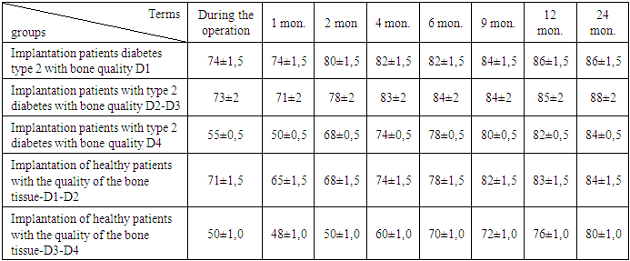 Integration of bone components, due to the formation of mineralized areas of direct contact with the bony structures of the implant surface. The integration of the implant with bone structure more pronounced than in previous terms in all comparative groups.The best indicator of ISQ / CSI for the secure functional load is higher than 70 units. In assessing osseointegration of implants precision measurement stability, in instrument indication «Osstell» (Sweden) sufficiently rigidly attached components installed repeatability with high accuracy. An objective method for primary stability studies and distant osseointegration of dental intraosseous screw implants to evaluate the primary stabilization of the implant.Conclusions1. The data on assessment of the bone structure indicate the rationality and objectivity of research methods to facilitate a correct assessment of the state of the bone tissue before implantation and the choice of method of implantation and osteoplasty.2. In use of osteoplastic material bioglass “bioactive glass” in aggregate with PRP or gialuronic acid to prevent inflammation and atrophy of the bone under optimization conditions of reparative process in the bone.3. The use of hyaluronic acid activates inhibitors or retarders metalloprotienaz and thus effectively prevents the destruction of tissues. A similar effect is achieved by slowing the cytokines that cause inflammation (eg TNF α). Thus, hyaluronic acid may help preserve tissues.4. This microbiological research suggests a positive impact sound application of antimicrobial and antiseptic agents on wound regeneration after dental implantation.5. Targeted use of antimicrobials help to reduce the concentration of microorganisms in periodontal surgical wound and reduces the number of inflammatory complications. Predict the possible inflammatory complications in the postoperative period in the species composition of microorganisms and to conduct timely medication.6. Dynamic observation of morphological and functional restructuring of the bone tissue can correctly determine the optimal time of prosthesis and prevents complications in patients with diabetes during dental implantation with bone augmentation, followed by a decrease in terms of rehabilitation.7. By the method of resonant frequency implant stability analysis and evaluation of the quality of bone Haunsfield scale units - HU can prevent complications associated unreasonable early loading of the implant.8. Using the device «Osstell ISQ» tuned to a resonant frequency analysis of the RFA (Resonance Frequency Analysis) to assess the primary stability of the implant rate and distant osseointegration, to prevent complications related to unreasonable early loading of the implant, and the choice of optimal period of prosthetics and reducing the time of prosthetic treatment.