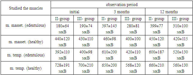 According marked increase in EMG activity of masticatory muscles during early functional loading.The results of electromyographic studies in patients in the second group showed a similar pattern, i.e., the parallelism of changes in BEA and asymmetry in patients of III group, but this occurred more slowly to 12 months., indicating that the process of adaptation of the masticatory muscles to the prosthetic constructions, and coordinating the restructuring of the BEA (table 1).The results of electromyographic studies have shown that at baseline, most patients at rest were recorded weak bioelectric activity (BEA) of the masticatory muscles. After early functional load was restored, a coordinated work of muscle, and increased their functional activity.The analysis of the received electromyographic indicators in patients 3 groups revealed visible changes in the functional States of the masticatory muscles depending on the time of implantation and subsequent prosthetics.
