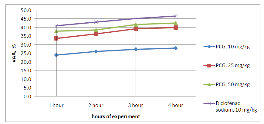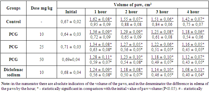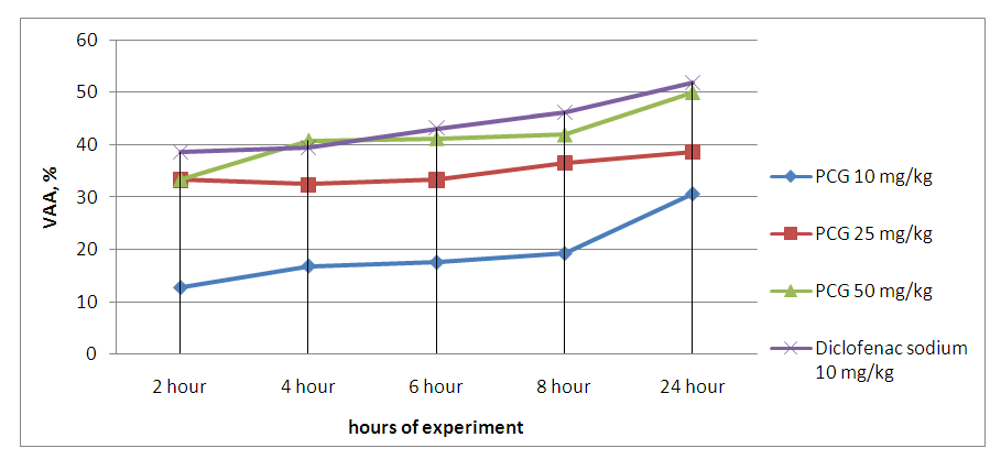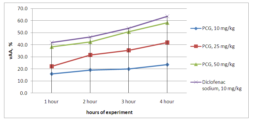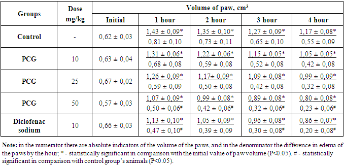 The experiments were carried out on sexually matured white male rats with an initial weight of 160-180 g. Before the experiment, the animals were quarantined for 12-14 days. All animals were kept in vivarium condition (with natural lighting, at a temperature of 22-24°C, relative air humidity 55-60%) in plastic cages 55x45x15 cm in size, with sawdust bedding, 6 animals per cage. Experimental studies were carried out in accordance with the "Rules for laboratory work using experimental animals", as well as the rules given in the European Convention for the Protection of Vertebrate Animals used for Experimental Research or for Other Scientific Purposes (ETS No. 123) Strasbourg, 18.03.1986.The anti-exudative effect of the drugs was studied on a model of acute inflammatory edema of the rat paw induced by the injection of the 0.1 ml 2% solution of formalin, 6% solution of dextran and 0.1% solution of histamine into subplantar aponeurosis of the right hind limb of the animal [6,7,8]. Diclofenac sodium at a dose of 10 mg/kg and PCG at doses of 10, 25 and 50 mg/kg were intragastrically administered to the experimental animals 1 hour before the reproduction of the model of inflammation, respectively. The control group of rats received an equivalent volume of water. The volume of the right hind paw of the animals was measured using a plethysmometer before and 1, 2, 3 and 4 hours after the injection of dextran and histamine, and 2, 4, 6, 8 and 24 hours after the injection of formalin. The value of anti-inflammatory activity (VAA) of drugs was calculated according to the formula [6,7]:VAA = Vcontrol-Vexperiment / Vcontrol x 100 = %Where: Vcontrol - the average increased volume of the rat’s paw of control group, Vexperiment - the average increased volume of the rat’s paw of treated group [6].The obtained research results were processed by the method of variation statistics using the standard StatPlus 2009 software package with an assessment of the significance of indicators (M±m) and differences in the samples under consideration by the Student's t-test. The difference was considered significant at a probability level of 95% and more (P<0.05).