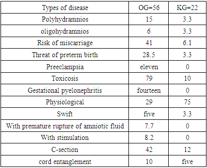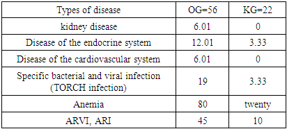 Based on the set goal, first of all, in the examined children, it was necessary to study the risk factors for the disease, taking into account the obstetric history of the mother. To do this, a thorough history of pregnancy and childbirth was collected, using a questionnaire (composed arbitrarily) so, basically, in more than 50% of children, the age of mothers was on average 30 years old. More than 62% of women noted early preeclampsia of pregnancy, and about 37% of women, including severe eclampsia and preeclampsia, suffered from this number, 11% of women in the second trimester. Chronic diseases in the form of diabetes mellitus were found in 1 woman, kidney disease in 5 women, rheumatism in 3 women. In 3% of women, had TORCH infection (cytomygalovirus, herpes virus). Separately, women with autoimmune goiter were noted (consultation of an endocrinologist during the entire pregnancy confirms this fact), thyroid dysfunction was detected in 29% of women. 2 women (excluding seizures during eclampsia) have epilepsy, one of the two took anticonvulsants throughout the pregnancy, the other only the first 2 months.Table 1. Diseases of mothers of examined children during pregnancy (%)  |