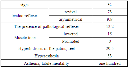 Thus, in the examined children with enuresis, only 6 women had a favorable obstetric history during pregnancy. As for the births themselves, preterm births in 28.5%, 42% delivery by Caesarean section, with placental abruption, 2 women were admitted to the maternity ward, protracted births (often first births) were noted in 10%. That is, complicated births were noted in 58% of mothers whose children suffer from enuresis, which is noted as a risk factor for enuresis in the presence of perinatal encephalopathy in children.Thus, based on the study of the occurrence of predisposing and provoking factors in children, it is possible to calculate the risk factor for the development of enuresis. Using standard anthropometric scales for assessing physical development, we determined the nature of violations of indicators in comparison with a healthy group of children of identical age. Of the examined children of the main group (MG), children with low body weight 43% with growth deficiency (body length) 21%. The body mass index (the ratio of weight and height) had an average decrease of 20%, and very low rates of 17% of children. Bedwetting is associated, according to many authors of the literature, with a violation of the autonomic nervous system, both sympathetic and parasympathetic. Accordingly, the study of the nature of the disturbance in the NS in the examined children with enuresis was necessary to confirm the role in the nervous system in the formation of the disease. When assessed by the values of diagnostic pressure and pulse, we studied the indicator of the activity of the ANS (Kerdo index). A significant difference between the MG and the control group (GC) was revealed, at the same time, a shift towards below zero in 67% was noted, which confirms the assumption of shifts in the autonomic balance in children with enuresis towards the parasympathetic department, which indicates the active participation of the ANS in the mechanism of nocturnal urinary incontinence (enuresis).The next step in the work was a survey of clinical and neurological signs of the disease. The average age of the surveyed was 10 ± 2 years, while boys were predominantly more than 85%. An important point was recorded during the collection of anamnesis, the children were found to have a hereditary burden for the disease, the presence of this pathology in a straight line (in the father and mother).According to the parents, the leading complaint of urinary incontinence was noted in all the examined main group. At the same time, 2 children had involuntary movements (tics); logoneurosis was noted in 1 patient, 1 patient was admitted with a complaint of pain in the legs (there was no desire to walk, a complete comprehensive examination revealed a hysterical reaction); 7 patients complained of headache; one patient had encopresis, and only during the day, and only when she was at home, no such signs were noted at school. When examining children, neurological changes of the following nature were revealed (no violations were found on the part of the cranial nerves); on the part of the motor sphere - an increase in tendon reflexes, more from the legs in 73% of cases, a difference in reflexes (asymmetry) in 5 patients; pathological reflexes in 7 children of the Rossolimo type. Conversely, a decrease in tendon reflexes of the knee and Achilles reflex, muscle hypotension was noted in 9 patients. Sensitive disturbances prevailed in the direction of hyperesthesia, but since children could exaggerate this symptom artificially, in stationary conditions, this symptom was not reliable, but almost all parents noted signs of asthenia and aggressiveness. Several children refused to go to school for fear of urinary incontinence during the day; such children had a labile psyche, not sociable, retired, separated from the children's team.Table 3. Clinical and neurological disorders in children with enuresis n =56  |