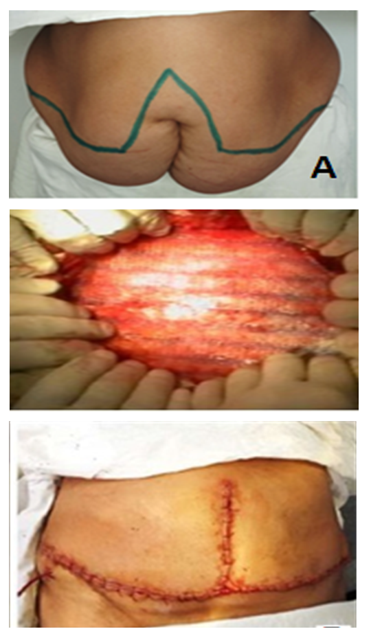 In 65.4% of the main patients and in 61.3% of the control group there was concomitant somatic pathology which required perioperative preparation: cardiovascular diseases in 40.6% of the examined patients, respiratory diseases in 11.8%, diabetes mellitus in 4.3%, III-IV degree obesity in 28.7% and others. - in 28.7%, etc. According to the ASA classification, 52.8% of patients corresponded to the 1st class, 36.5% - to the 2nd class, and 10.7% - to the 3rd class. In assessing the operative-anesthetic risk we took into account not only the presence of somatic pathology, but also its clinical and laboratory signs. The choice of surgical access was primarily based on the location of the hernia gate, the location of the organ with concomitant pathology in the abdominal cavity areas. In this regard, a schematic dystopia was developed, i.e. the localization of the hernial defect on the abdominal wall and the location of concomitant pathology in the abdominal cavity. The nature of the hernial bulge was assessed according to the classification of Chevrel J.P. and Rath A.M. and the location of concomitant pathology was guided by the topographic division of the abdominal cavity into 9 regions.In the main group of patients (25.2%) the surgical stage of abdominal surgical pathology correction was carried out using the laparoscopic access; in 23 of them the hernioplasty stage was also performed using the endovideosurgical method. In 83 patients (74.8%) all stages of surgery were performed using a single herniolaparotomy access.At the same time the nature of the performed simultaneous surgeries were as follows: cholecystectomy for cholelithiasis - 36 (including LCE - 16), visceralysis for abdominal adhesions and chronic intestinal obstruction - 67, cystectomy from the liver - 6, Pancreas - 2, ovaries - 9 (laparoscopic cystectomy - 3), uterine amputation or extirpation - 35, and dissection of the cutaneous subcutaneous flap of the anterior abdominal wall - 32.Then we proceeded to the main stage of the operation - the liquidation of hernial defect. The choice of hernioplasty in both study groups was differentiated. Tension methods of alloplasty: - implantation of endoprosthesis "onlay" with suturing of the defect was performed in 47,1% of the main group and 49,5% - of the control group of patients.Non-tension methods: implantation of endoprosthesis "onlay" without suturing of the defect in 42,3% and 40,9%; implantation of endoprosthesis "onlay" without suturing of the defect with Ramirez mobilization of rectus abdominis muscle vaginas in 10,6% and 9,7% of patients in the main and control groups correspondingly. Intraabdominal endoprosthesis implantation was performed laparoscopically in 23 (20.7%) patients of the main group. Dermatolipidectomy along the line fringing the Castanares herniated bulge was performed in 26.4% of patients who had concomitant pathology in the form of II-III degree obesity and a sagging abdomen after the completion of anterior abdominal wall plasty (Fig. 1). | Figure 1. Stages of hernialloplasty with abdominoplasty: - incision line framing the hernial bulge according to Castanares (A); - implantation of endoprosthesis (B); - anterior abdominal wall at the end of the operation (C) |