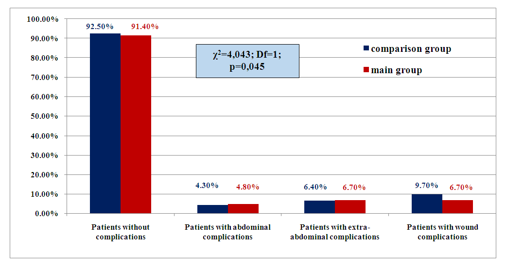 The following parameters were used as the main criteria to assess the effectiveness of the treatment results of the patients in the compared groups: abdominal complications of the early postoperative period; extra-abdominal complications of the early postoperative period; wound complications in the early postoperative period (Fig. 2).  | Figure 2. Frequency of complications in the compared groups in the immediate postoperative period |