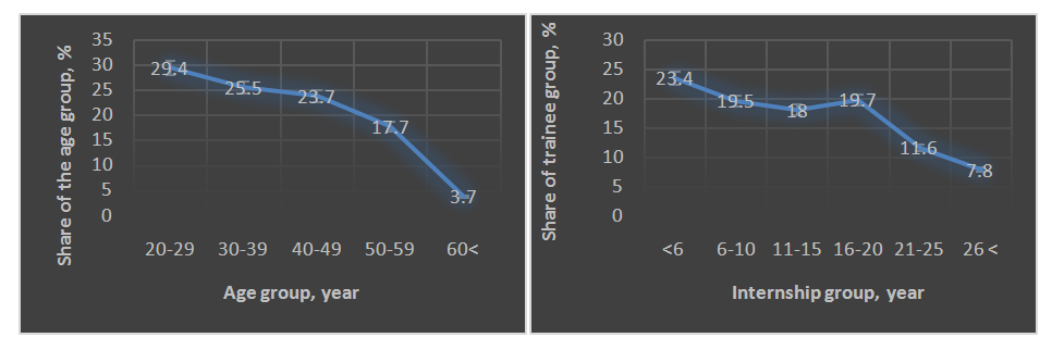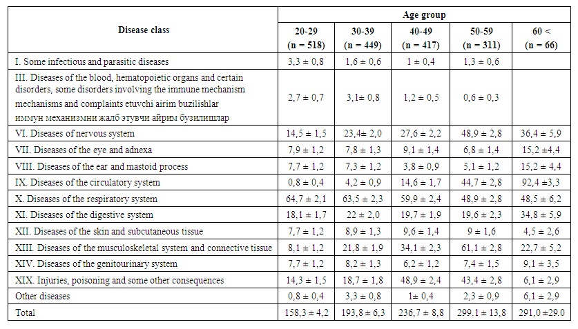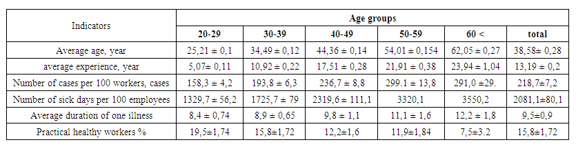 80.2% were men and 19.8% were women out of the selected 1791 workers. The average age of workers was 38.58 ± 0.28 years, and the average total length of service was 13.19 ± 0.2 years. The correlation coefficient showed that there is a direct and strong relationship between the average age of workers and the total length of service. (r= 0.81) (Table 1). Changes in the dynamics of the health status of workers, general morbidity depending on age and work experience in five (20-29 years old, 30-39 years old, 40-49 years old, 50-59 years old, 60 years and older) and six groups of internships (up to 6 years old, 6-10 years old, 11-15 years old, 16-20 years old, 21-25 years old, 26 years old and over). | Table 1. Health status of employees of different age groups |