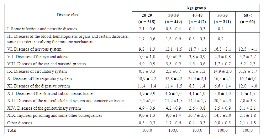 When analyzing professional groups of workers, repairmen and plumbers 26.0%, locksmiths 11.5%, grinders 10%, drillers 8.2%, operators 7%, electric welders 7.3%, turners 5.3%, drillers 5.2%, electro mechanics 3.9%. and other specialties 15.6%.The study of the features associated with an increase in the age groups of workers made it possible to identify significant changes in their health status, structure and level of morbidity (Table 2). | Table 2. Share of occupational diseases by main classes and age groups (in %) |