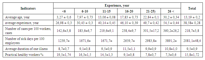 There are significant changes in the health status of workers with a work experience of 6-10 years: a relative increase in the number of diagnosed diseases per 100 workers and a decrease in the number of practically healthy workers (p<0.05).An increase in the number of diagnosed cases per 100 workers with work experience of 11-15 years by 1.54 times was noted, but no significant decrease was observed in practically healthy workers. The most pronounced increase in extensive and intensive distribution was observed in diseases of the respiratory system (p<0.05).An increase in the number of diagnosed cases per 100 workers with an experience of 16-20 years by 1.67 times was noted, but in practice, a 2-fold decrease was observed in healthy individuals (p = 0.05).A decrease in growth and diseases of the respiratory organs was noted due to diseases of the circulatory system, diseases of the musculoskeletal system and connective tissue, injuries caused by external causes, poisoning and some other consequences. It has been established that the dynamics of health indicators of miners in groups of 21-25, 26 and more work experience is significantly lower than in groups with 6-10 and 11-15 years of experience.The number of diagnosed cases per 100 workers increased by 2.57 times, but in practice the number of healthy individuals decreased by 2.67 times (p = 0.05). Diseases of the nervous system and the circulatory system is increasing with the increase in work experience. Diseases of the musculoskeletal system and genitourinary system, respiratory and digestive organs, the degree of endocrine pathology did not change significantly.