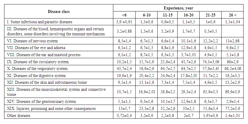 In the age group of 50-59 years, the incidence increased by almost 2 times per 100 workers, and the number of practically healthy workers decreased by 1.7 times. (p = 0.05). The incidence of diseases of the circulatory system and the nervous system has increased, the incidence of respiratory diseases has decreased (p<0.05).Due to the small number of workers aged 60 and over, it was difficult to analyze changes in their health. There were almost no healthy people among them, and the increase in the number of diseases per worker was statistically unreliable (p = 0.05).Thus, the first part of the study showed that 1/5 of workers under the age of 30 are practically healthy workers. The structure and degree of their incidence is dominated by respiratory diseases, injuries caused by external causes, poisoning and some other consequences, diseases of the digestive system and diseases of the nervous system. There is a deterioration in the health of workers in the age group of 40-49 years.The second part of the study is related to the study of the health status, structure and degree of morbidity of workers with different work experience (Table 4). An analysis of the results of a scientific study showed that more than 20% of employees with less than 6 years of work experience do not have chronic diseases. | Table 4. The health status of workers with different work experience |