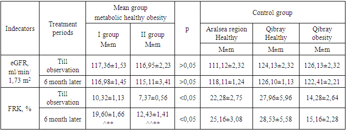 In total 123 individuals, including 83 individuals with metabolic healthy obesity at levels 1 and 2, 20 practical healthy individuals from the South Aral Sea Region, 10 practically healthy individuals from the Qibray District of the Tashkent region, and 20 individuals with metabolic healthy obesity were selected. They were between 25 and 50 years old and averaged 36.83±0.72. Females made up 45 (54.21%). All individuals were placed on outpatient observation and separated into primary and control groups. The core group was divided into 2 groups based on body mass index (BMI): 1 group was made up of 46 individuals with metabolic healthy obesity comprising BMI 30-34.9 kg/m2,2 groups were made up of 37 individuals with metabolic obesity comprising BMI 35-39. 9 kg/m2. The control group was made up of 20 practically healthy individuals from the South Islet Region, 10 practically healthy individuals from the Qibray District of the Tashkent region and 20 individuals with metabolic healthy obesity. Even 50% less than the recommended minimum hypotensive dose of the drug Edarbi, i.e. 10 mg per day, from the group I and II of patients of the established group involved in the trial, and the indicators of the functional state of the kidneys after the 3rd and 6th month of the initial and follow – up of patients – estimated glomerular filtration rate (eGFR) and functional reserve of kidneys (FRK) were compared.