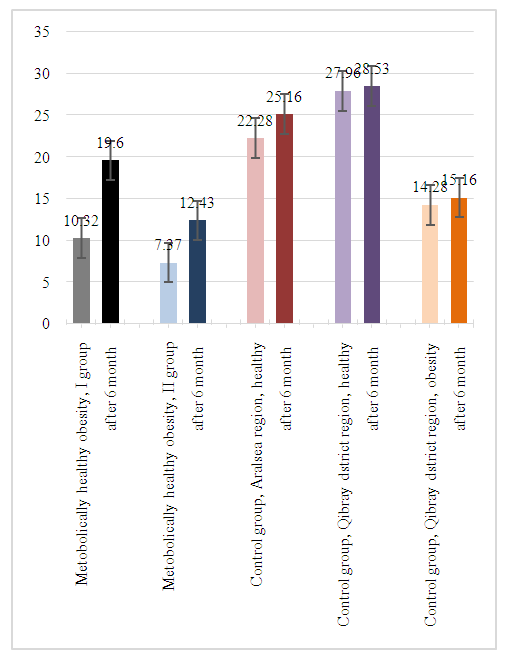 In the group of Group I receiving 10 mg per day of Edarbi peraratin, this indicator, when examined for observation and pre-intervention eGFR, was 117.36±1.53 ml/min/1.73 m2, while in the 3rd month this indicator was 119.50±1.79 ml/min/1.73 m2, and by the 6th month of the study, the eGFR indicator was 116.98±1.45 ml/min/1.73 m2 (p>0.05). However, it has been known that the differences are at an implausible level when these changes are compared with indicators before and after observation and interventions and in control group representatives, which also expresses an inadequacy in assessing the functional state of the eGFR kidneys. In the case of FRK indicators, the following results were recorded: the FRK average before observation and intervention was 10.32±1.13%, while the average of this indicator in the 3rd month of observation was 13.61±1.10%, and by the 6th month of examination was 19.60±1.66%, in which the results differed convincingly before and after treatment and in relation to the control group (p<0.001). In order to more accurately represent such a growth rate of dynamism, we will consider dividing patients into 3 groups according to the types of FRK condition. It is known that we divided each of the main group into “no”, “decreased” and “saved” groups of reserves according to the FRK. Earlier in the study, the ratio of this group I to Edarbi intake-initial FRK indicators was as follows: the number of patients without or “no” FRK was 4 , patients with a “decreased” in FRK was 1, and the number of patients with FRK “saved” was 13. By 6 months of the study, no patients with “decreased” were observed at all, that is, due to their improvement in FRK, these group patients joined FRK “decreased” and “saved” groups, the number of patients with a decrease in FRK increased from 1 to 2 people, this increase occurred due to the addition of FRK among them to the group of those with, the initial FRK indicator was found to have increased by 90% by the 6th month of observation and intervention (χ2=29,478; p=0.00026).In the group of Group II that received 10 mg per day of Edarbi, this indicator, when examined for observation and pre-intervention eGFR, was 116.95±2.23 ml/min/1.73 m2, while in the 3rd month this indicator was 117.39±3.07 ml/min/1.73 m2, and by the 6th month of the study, the eGFR indicator was 115.11±3.41 ml/min/1.73 m2 (p>0.05). However, it has been known that the differences are at an implausible level when these changes are compared with indicators before and after observation and interventions and in control group representatives, which also expresses an inadequacy in assessing the functional state of the eGFR kidneys. In the case of FRK indicators, the following results were recorded: the average FRK before observation and intervention was 7.37±0.56%, while in the 3rd month of observation, the average of this indicator was 9.58±0.76%, and by the 6th month of examination, 12.43±1.41%, in which the results differed convincingly before and after treatment and compared to the control group (p<0.001). In order to more accurately represent such a growth rate of dynamism, we will consider dividing patients into 3 groups according to the types of FRK condition. It is known that we divided each of the main group into “no”, “dropped” and “saved” groups of reserves according to the FRK. Earlier in the study, the ratio of this group I to Edarbi intake-initial FRK indicators was as follows: the number of patients without FRK was 8 , patients with a decrease in FRK was 2, and the number of patients with saved FRK was 0. By 6 months of the study, no patients with FRK were observed at all, that is, due to their improvement in FRK, these group patients joined FRK decreased and stored groups, the number of patients with FRK decreased increased from 2 to 4, this increase occurred due to the addition of FRK to the group of saved among them, ultimately the growth rate of FRK, the initial FRK indicator was found to have increased by 69% by the 6th month of observation and intervention (χ2=29,478; p=0.00026). These indicators are presented in Table 1.Table 1. Assessment of the effect of the drug azilsartan medoxomil (Edarbi), an antagonist of angiotensin II receptors, on the functional state of the kidneys in metabolic healthy obesity  |