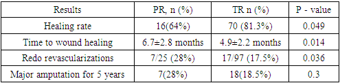 In eight cases of PR group, we found a single branch connecting the PA with the pedal arterial arch in angiography, while 17 (68%) extremities had both branches connecting with the branches of both tibial arteries. Of the patients in the TR group, 45 (58.4%) cases were with an acceptable arterial arch with retrograde filling of the branches of another artery, and 32 (41.5%) extremities had only the lone arterial pool.Technical success, either PR or TR, was achieved in all patients in both groups; as a result, foot warming and rest pain relief were observed in all patients in the first group with biphasic blood flow on the PA on ultrasound, and in patients of the second group - with pedal palpable pulse with foot warming and rest pain relief.The patients of PR group had not experienced postoperative complications, but TR group experienced two major complications: one patient experienced an acute myocardial infarction that was fatal the day after the procedure (1 (0.9%)), and the other patient experienced a false aneurism of a punctured artery that required surgical intervention. Six patients in the first group and five in the second group had small subcutaneous hematomas at the puncture site, which did not require surgical intervention.The first group's mean preprocedural ABI was 0.42±0.1, while the second group's was - 0.44±0.01. Both groups' postprocedural ABIs increased to 0.81±0.07 and 0.86±0.05, respectively, after the procedure. The ABI in the groups was 0.76±0.13 and 0.77±0.14, respectively, six months after procedure, and 0.66±0.15 and 0.68±0.14, respectively, a year later.Table 2. Follow-up results for 5 years  |